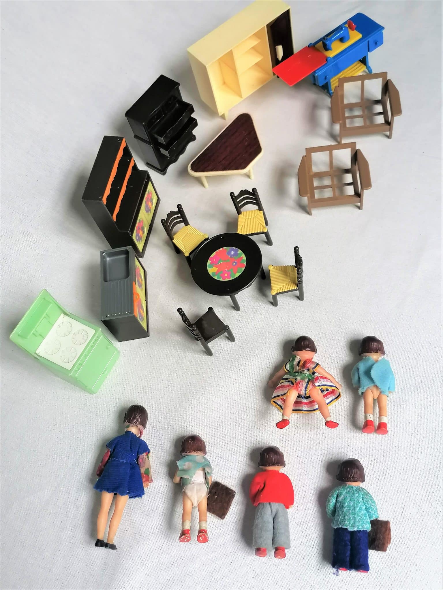 Ensemble de petites poupées et mobilier pour maison de poupée miniature.